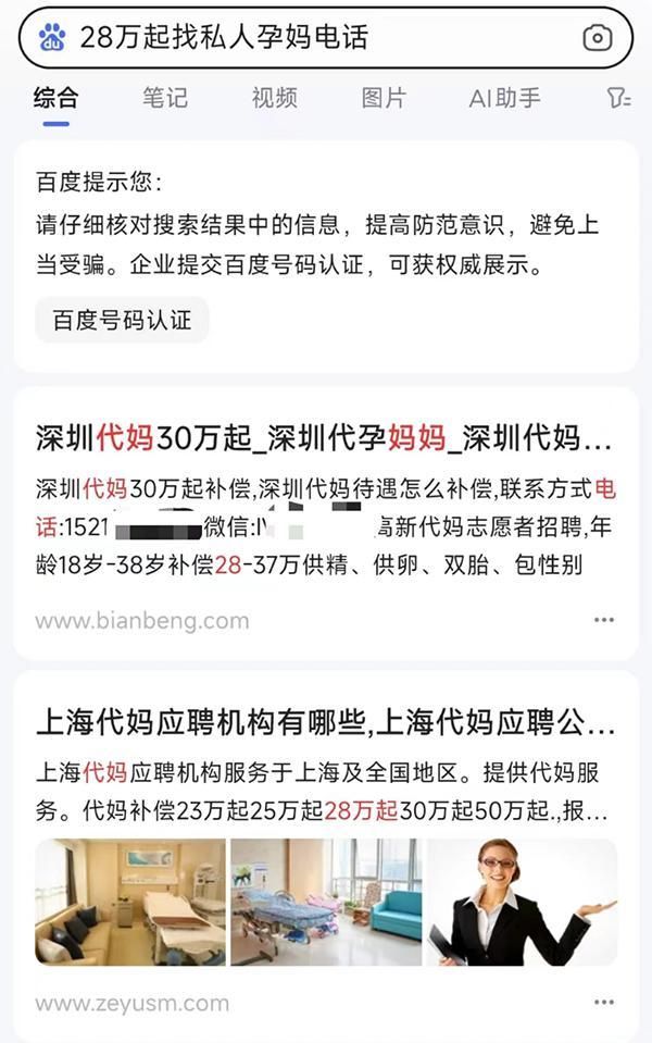 其中,在百度搜索相关关键词发现,有“深圳代妈30万起,深圳代孕妈妈们,高新代妈志愿者招聘,年龄18岁-38岁,补偿28万-37万供精、供卵、双胎、包性别……”内容,这则内容甚至附有联系方式和微信号。
