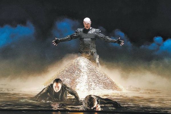 铜管低沉,弦乐叠加,往复回旋的音响如浪涛拍岸,层层荡开。大幕拉开,一方波光跃然台上,仙女在莱茵河的怀抱里翻滚徜徉,当音流抵达高潮,守护着黄金的她们开始歌唱。在这派如同混沌初开的壮丽景象中,悠远的传说奏响先声。昨日,国家大剧院制作的瓦格纳歌剧《莱茵的黄金》迎来首演,由此,宏大的“指环”之旅正式启程。