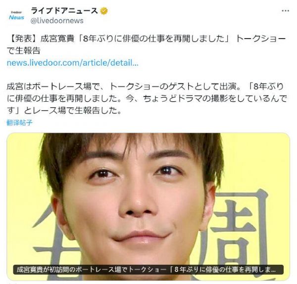 成宫宽贵 宣布复出:“时隔8年我重新开始了演员工作、现在正在拍摄电视剧”