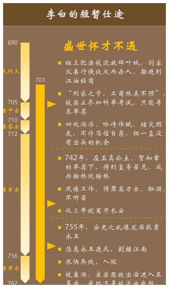 ”,什么意思呢?犯人和经商者的子女,都禁止参加科举考试。李白倒好,这两样都沾上了,要想走仕途的话,只能靠别人举荐。再来看他具体生活的年代,701-762年,武则天的武周是690-705年,唐玄宗在位时间是712-756年,其中开元盛世是712-741年。可以看到,李白的青壮年时期正好处于唐朝的鼎盛时期。