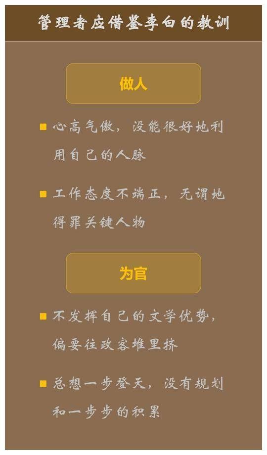 最后总结一下:管理者需要综合能力,只靠某一方面的专业能力,是不可能成为合格的管理者的。跟李白同时期的很多朝廷大员也都是文学大家,但他们并没有局限在文学领域,而是在仕途上勤勉耕耘,因而人生更为成功。