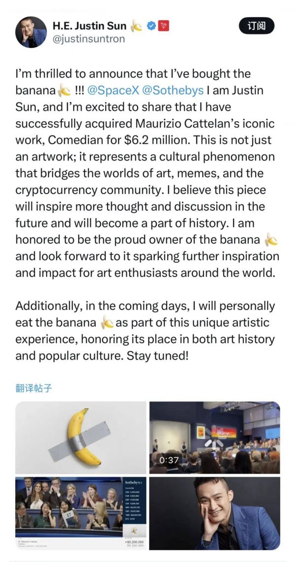 孙宇晨花费624万拍下美元“天价香蕉”!将使用加密货币支付