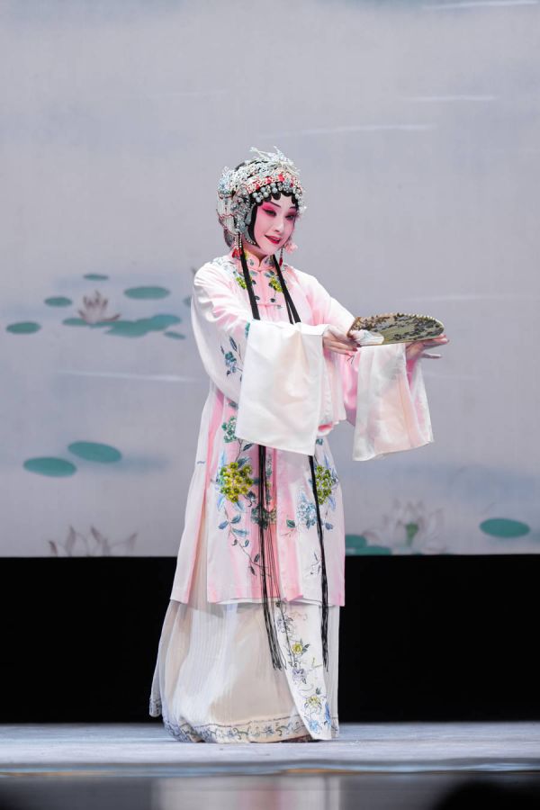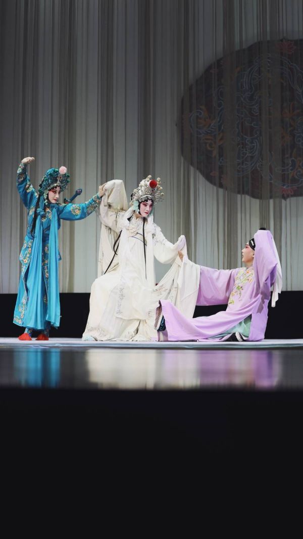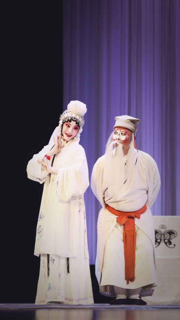 《蝴蝶梦•说亲》表现田氏表面守灵,心底另有改嫁期待,是闺门旦双面情感表演的经典案例。“15年前,我学习《说亲》,现在重新排练,第一次公演。”张冉表示,田氏是她饰演的唯一不穿水袖的角色,用一双手辅助塑造人物,“一身雪白行头的田氏,以手中一块大红手帕衬托,随着上场所念‘不如意事常八九,可与人言无二三’,内心的渴望、焦躁、担忧、矛盾在唱念做舞中展现丰富层次,在爱情的盲目与内心的道德两难之间,戏剧冲突得以展现。”