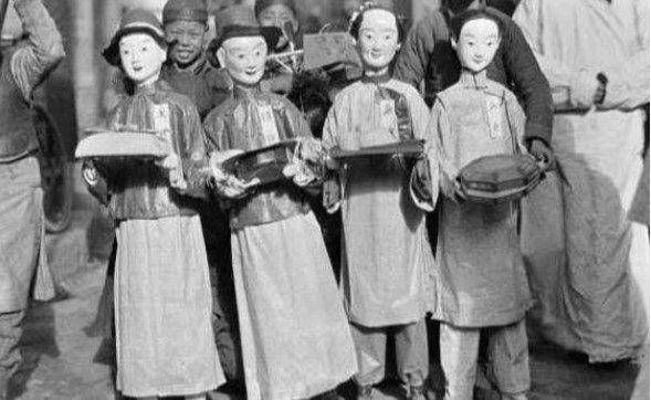 纸人纸马是旧时葬礼上的一道风景,晚清的葬礼上都会用到扎纸人,这是中国葬礼上的传统,现在有的农村还在沿用。逝者生前有的,死后也要给她复制一份烧去,烧掉即可跟随死者去另外一个世界,坐拥荣华富贵。这些纸扎人个头不低,都赶上后面的孩子了。最重要的是这些纸人手工精巧,表情各异,惟妙惟肖,看久了还真的有点让人害怕。