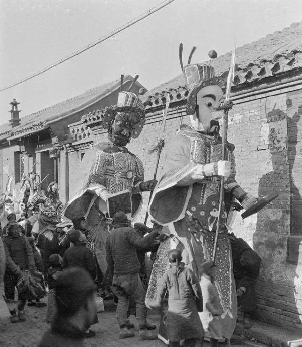 葬礼上的巨型纸人,这样的纸人用在葬礼上现在难以见到。这个纸人给人感觉非常恐怖,好像天上的神兵下凡,尤其是后面这个纸人,凶神恶煞,让人看着十分害怕。也不知道当时的人们是如何让这些庞大的纸人固定住的,万一有大风了,会不会给吹到了?不过不得不承认,晚清的手艺人还真是厉害,能做出这么庞大,传神的巨型纸人