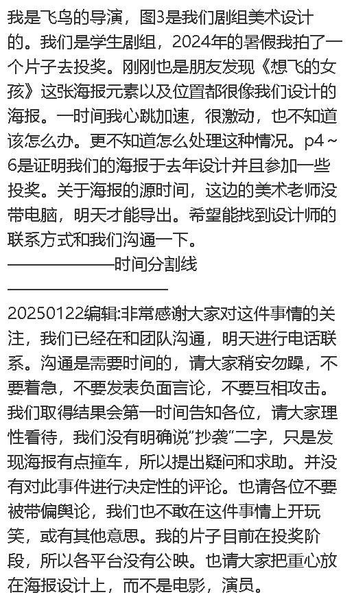 搜狐娱乐讯 1月22日,有网友发文称,发现《想飞的女孩》海报与自己设计的《飞鸟》海报撞车,在创意和构图上都十分相似,引起一阵热议。随后,该网友表示已经在和团队沟通,并呼吁大家不要发表负面言论和互相攻击,“我们没有明确说'抄袭'二字,只是发现海报有点撞车,所以提出疑问和求助。并没有对此事件进行决定性的评论。也请各位不要被带偏舆论。”
