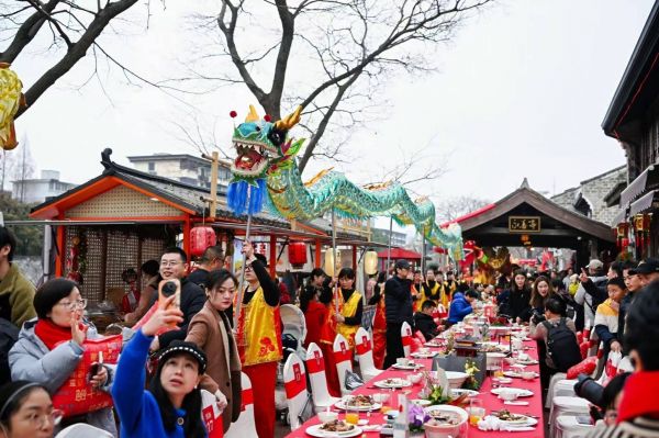 央广网宁波1月25日消息(记者 刘欣莹)1月24日,“金蛇舞春·欢喜宁波”2025宁波文旅年味大集在海曙南塘老街热闹开锣。202.5米的长桌宴沿南塘河畔铺开,以“甬菜百碗”为代表的数百道宁波佳肴缤纷亮相,众多市民与国内外游客一同吃大席、逛大集、看大戏,感受首个“非遗春节”的浓浓年味。