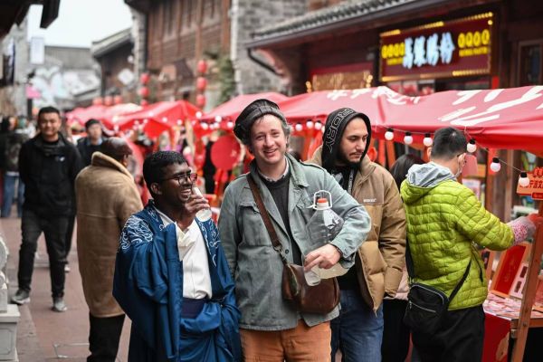 此外,活动现场,有宁波市民,有从杭州、绍兴等地驱车赶来的游客,还有众多国际友人。中外游客围坐在长桌前,共同品尝宁波的地道菜肴,交流着特色美食和文化体验,共同庆祝即将到来的中国新年。“这是我第一次在中国感受如此地道的春节氛围,感到非常新奇和温暖。”一位来自塞尔维亚的游客特地身着汉服,前来体验这场文旅大集,他兴奋地表示。