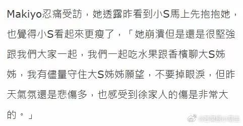 #S家人与亲友一起吃水果喝香槟聊大S##Makiyo称小S崩溃变瘦# Makiyo采访透露昨天去S家聚会细节,觉得小S看起来更瘦了,她崩溃但还是很坚强,和大家一起吃水果喝香槟聊大S,Makiyo说有尽量守住大S的愿望,不要掉眼泪,但昨天气氛还是悲伤多,也感受到徐家人的伤是非常大的。