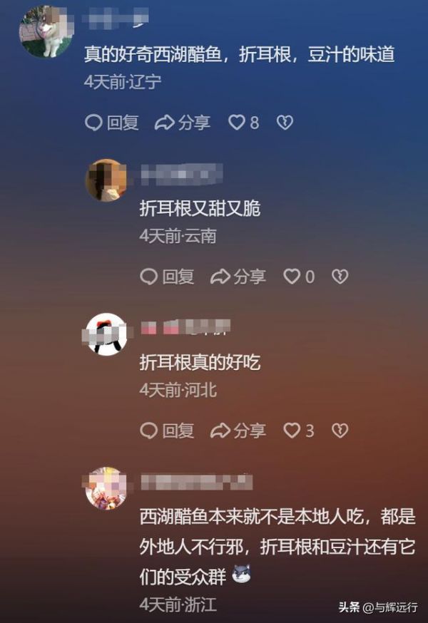 甚至有网友评价:西湖醋鱼本来就不是本地人吃,都是外地人不信邪,折耳根和豆汁起码还有它们的受众群体!真的很好奇西湖醋鱼、折耳根和北京豆汁儿的味道,有吃过的朋友留言说一下感受,我避避雷!