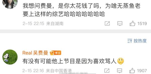搜狐娱乐讯 近日,吴镇宇在表演类综艺的表现引发热议,对此,网友在评论区开玩笑的问吴费曼吴镇宇上综艺是不是因为费曼太花钱了?费曼幽默回答:“有没有可能他上综艺是因为喜欢骂人” ,幽默的回答引发不少网友讨论。