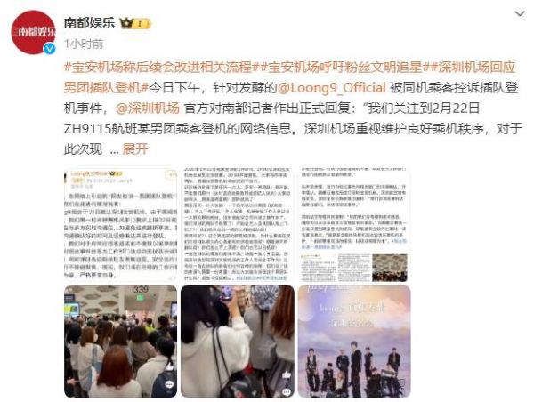 今日下午,针对发酵的Loong9男团被同机乘客控诉插队登机事件,深圳机场官方对南都记者作出正式回复:“我们关注到2月22日ZH9115航班某男团乘客登机的网络信息。深圳机场重视维护良好乘机秩序,对于此次现场管理给部分旅客出行体验带来的影响,我们表示歉意。后续,机场将会同航司优化改进相关保障流程,加强现场管理,为旅客提供更好的出行服务。我们也呼吁粉丝群体在机场等公共场所理性追星,遵守机场秩序,共同营造文明有序的乘机环境。”
