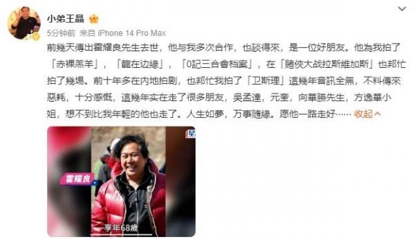 导演王晶悼念好友霍耀良:想不到比我年轻的他也走了