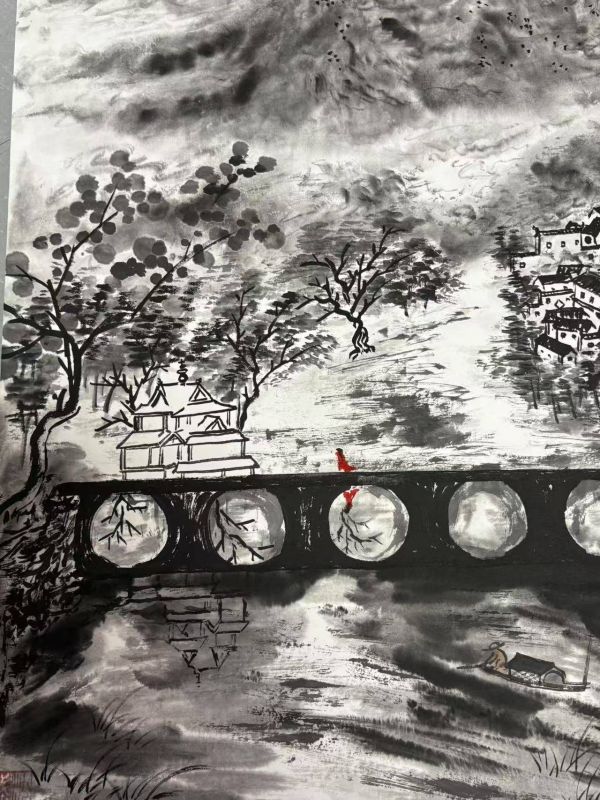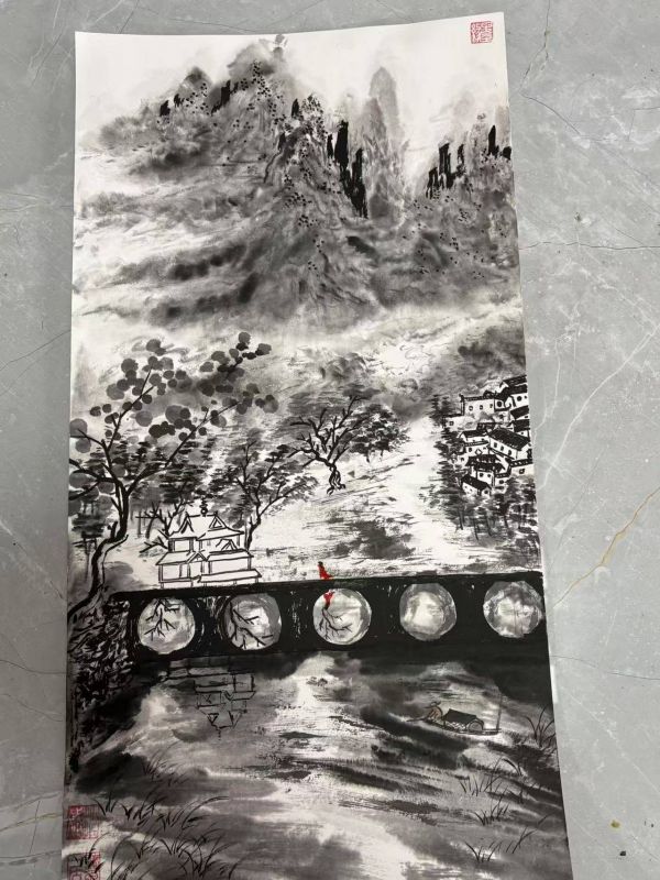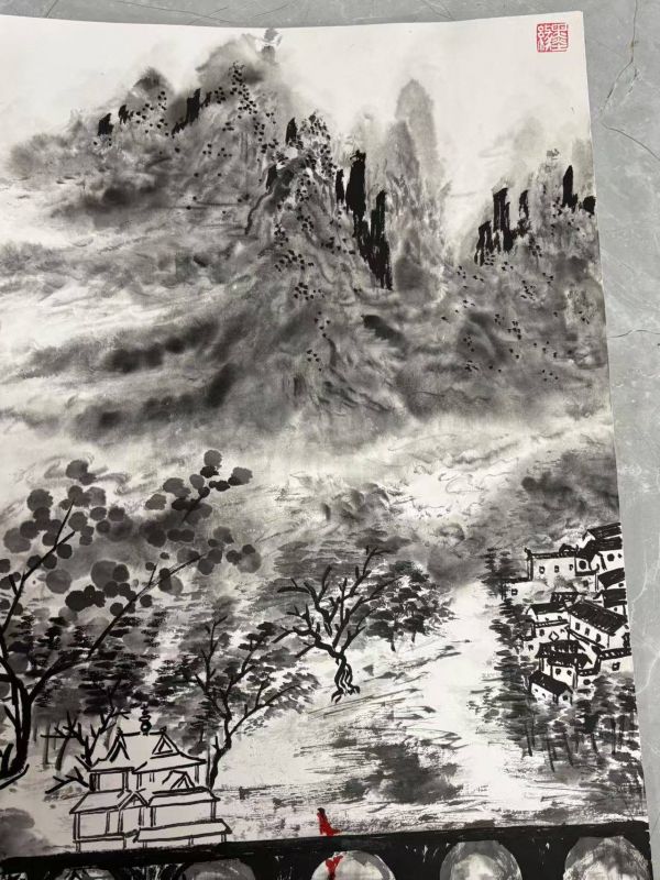 山水画造诣深厚:沈斌自幼对中国山水画表现出浓厚兴趣,11岁起师从刘海粟的高徒庄凯,打下了坚实的绘画基础。经过多年的训练和积累,他的山水画技法娴熟,疏密有致,浓淡相宜,达到了“意到笔随、一挥而就”的境界。这种功力不仅体现了他对传统技法的掌握,也反映了他对自然和艺术的深刻理解。
