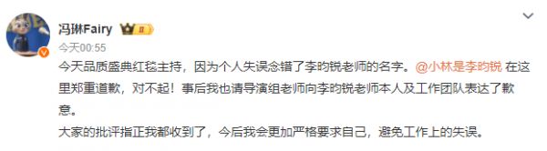 冯琳为念错李昀锐名字道歉:事后请导演组老师向本人表达了歉意