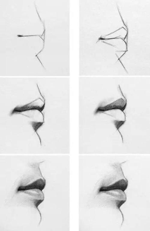 5、全侧面角度嘴部表现规律: 嘴唇的形在侧面表现中需要画得饱满一些, 这样有助于肉感的表现。上唇的上翘、下唇的下垂要更加明确地表现出来。