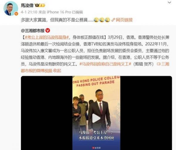 4月1日,马浚伟发出2年前的采访报道澄清:“多谢大家赏识,但我真的不是公务员。”