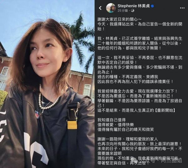 林美贞8日正式宣布与孙兴结束二十多年的婚姻,并表明从今以后,孙兴的任何行为与她和儿子无关。她表示“无论过去有多少爱与伤痛、多少欺骗与不堪,到此为止!”她拒绝否定自己的感受,并决心放下过去的爱与伤痛,重新拥抱自己,追求属于自己的快乐与未来。