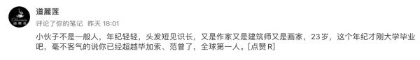 艺术从业者评论“小伙子不是一般人,年纪轻轻,头发短见识长,又是作家又是建筑师又是画家……毫不客气地说你已经超越毕加索、范曾了,全球第一人。”