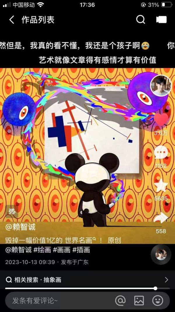 赖智诚的争议性正源于他的“矛盾成功学”。一面是学术界的赞誉:他的抽象系列被纳入湖北美术学院馆藏,并被比作“东方马列维奇”;另一面是商业市场的狂热:DARTPANDA盲盒单价破十万,限量版画一画难求。有人批评其作品“过于媚俗”,但他坦言:“艺术需要与时代对话,而非困在象牙塔。”