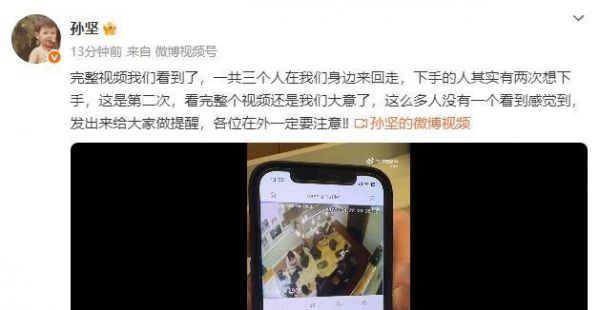 孙坚写道:“完整视频我们看到了,一共三个人在我们身边来回走,下手的人其实有两次想下手,这是第二次,看完整个视频还是我们大意了,这么多人没有一个看到感觉到,发出来给大家做提醒,各位在外一定要注意!”