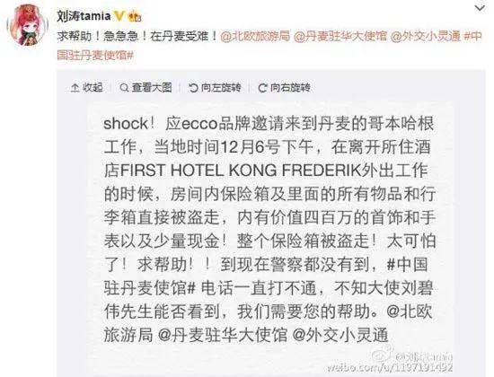 早在2015年,刘涛在丹麦酒店遭遇盗窃,保险箱400万首饰被盗,经网络求助破案。