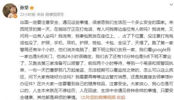 据此前报道,4月23日,孙坚发文称:“来西班牙的第一天,在咖啡厅正在打电话,有人问我旁边座位有人坐吗?我说有,又问另一边有人坐吗?我说有,我拿包就放在座位上,占了下位置,没注意打完电话包没了,护照、手机、耳机、钱包、卡包,全没了,天塌了。”