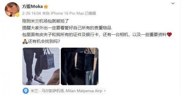 27日晚,方媛在社媒再次发文回应此事,表示事情发生后,已及时报警及寻求中国驻米兰大使馆协助,大使馆的工作人员效率十分高,迅速处理,“也让我感受到了祖国的温暖!”