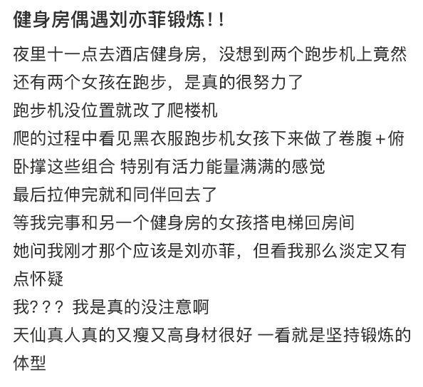 网友在健身房偶遇刘亦菲:晚上11点还在跑步卷腹俯卧撑