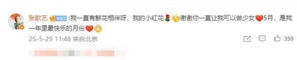 29日,袁弘于社交平台晒照为妻子张歆艺庆生,配文写道:“祝你生日快乐,一路鲜花相伴~我永远的小姑娘。”张歆艺在评论区甜蜜回应:“我一直有鲜花相伴呀,我的小红花,谢谢你一直让我可以做少女。5月,是我一年里最快乐的月份。”