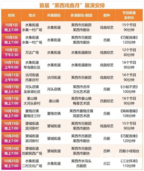 整个10月的每个周末,“莱西戏曲月”还将开展“周末戏相逢”系列活动,《巧配良缘》《三女拜寿》《小姑不贤》《姊妹易嫁》等经典吕剧大戏轮番上演。从10月2日至25日,演出将覆盖水集街道、沽河街道、河头店镇、姜山镇、夏格庄镇、望城街道等多个镇街,地点包括水集一村广场、万达广场、社区广场、村落广场等,参演团队涵盖莱西市吕剧团、莱西市剧协及各镇街艺术团,节目数量12至16个不等,单场演出时长80至120分钟,满足不同区域市民的观演需求。(记者 谷正原)
