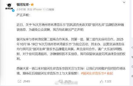 时间:2025年10月03日 19:1810月3日,@银河左岸- 发文:近日,关于“N次方扬州枣林湾音乐节”的风波而无故关联“银河左岸”品牌的各种错误信息,为避免公众误解,我方特此做出严正声明: 银河左岸与枣林湾仅第二届有合作关系,其第一届、第三届均无任何合作。2025年10月18-19日“N次方扬州枣林湾音乐节”为独立活动,其主办、运营及法律责任均与我司及“银河左岸”音乐节品牌毫无关联。并无任何合作。请广大乐迷仔细甄别,对于任何混淆视听、涉嫌侵权的不实信息,我司保留依法追究其法律责任的权利。 感谢大家一直以来对银河左岸音乐节的关注与支持!让我们共同维护良好的市场环境,期待在后续银河左岸音乐节上与大家相聚!