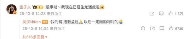 孟子义看到后在评论区留言回复吴汉坤:“没事哒,我现在已经生龙活虎啦。”吴汉坤表示:“我的锅,抱歉孟姐,以后一定顺顺利利的。”