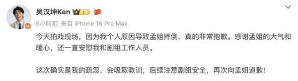 随后,吴汉坤发文向孟子义道歉:“今天拍戏现场,因为我个人原因导致孟姐摔倒,真的非常抱歉。感谢孟姐的大气和暖心,还一直安慰我和剧组工作人员。这次确实是我的疏忽,会吸取教训,后续注意剧组安全,再次向孟姐道歉!”