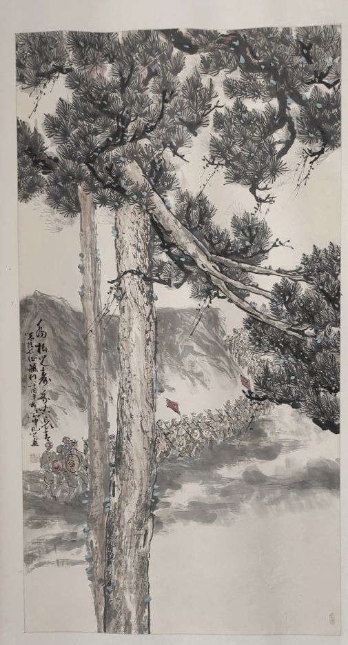 作品讲述: 这幅国画极具深意。画面中,挺拔苍劲的乔松傲然矗立,松针如铁,枝干如龙,象征着坚韧不拔的精神。其下,从遂川出发红军长征队伍坚毅前行,红旗猎猎,与乔松相互映衬。乔松寓意着长寿与不屈,正如红军长征所展现出的顽强意志和不朽精神,历经风雨而弥坚,跨越艰难险阻,向着希望迈进,这份精神必将如乔松一般万古常春,永远闪耀在历史的天空,激励着后人奋勇向前。