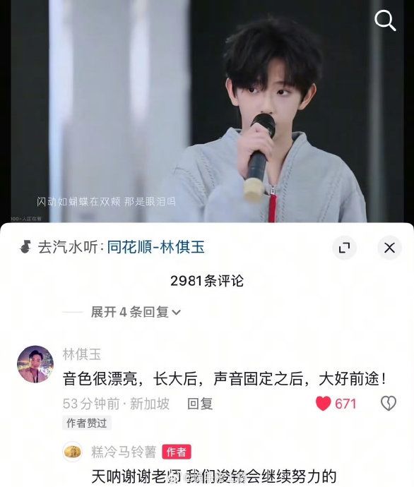 陈浚铭考核唱的《同花顺》视频在抖被原唱表扬啦