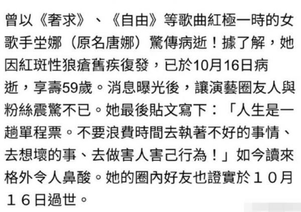 据台媒报道,中国台湾女歌手坣娜于16日病逝,享年59岁,死因疑似为红斑狼疮,此消息已获其友人证实。