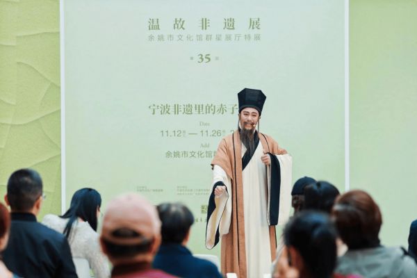开幕式从姚剧演员胡湛演绎的《王阳明》经典片段引入,展开了一场非遗中“知”与“行”的对话。姚剧市级代表性传承人王育红、甬式家具榫卯技艺市级代表性传承人鲁鸿辉、余姚土布制作技艺市级代表性传承人周梅芳、余姚市文化馆馆长甘银宝参与了本次沙龙分享。