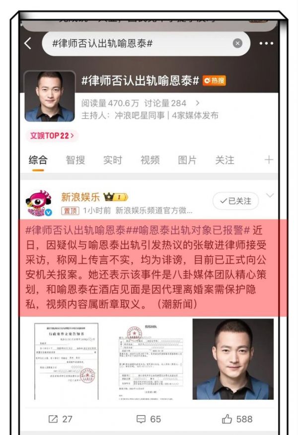昨日狗仔曝料喻恩泰疑是出轨女侓师,发布喻恩泰和律师挽臂去酒店视频!今日张敏进否定外遇喻恩泰,称视频被有心人精心策划,断章取义,称在酒店就是为了谈喻恩泰离婚官司!一时间引发全网热议!