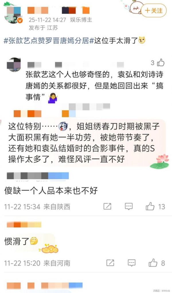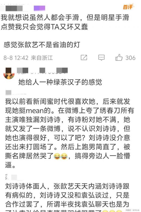 抓马的事情来了,张歆艺被网友发现(手滑)点赞了罗晋唐嫣分居的帖子,都是业内人士,很容易让人以为是真的,被骂上热搜榜后取消了点赞。