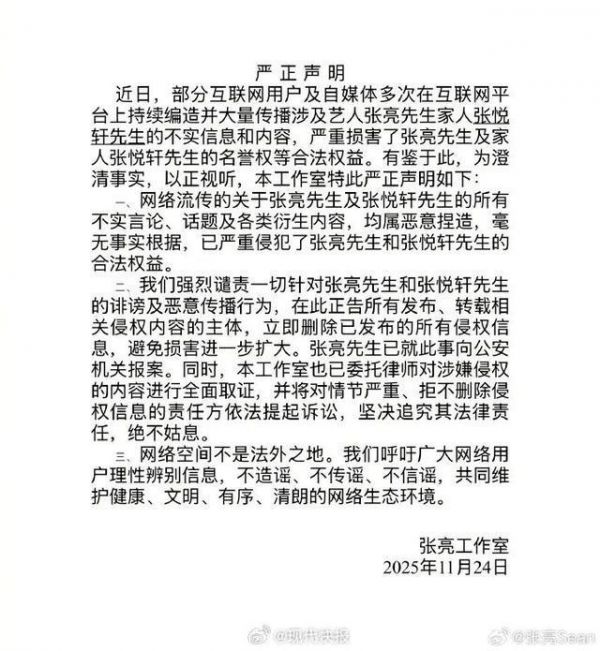 11月26日,张亮工作室发严正声明,表示近期网络上传播的大量关于张亮和张悦轩的不实信息和内容,严重侵犯了名誉权等合法权益。