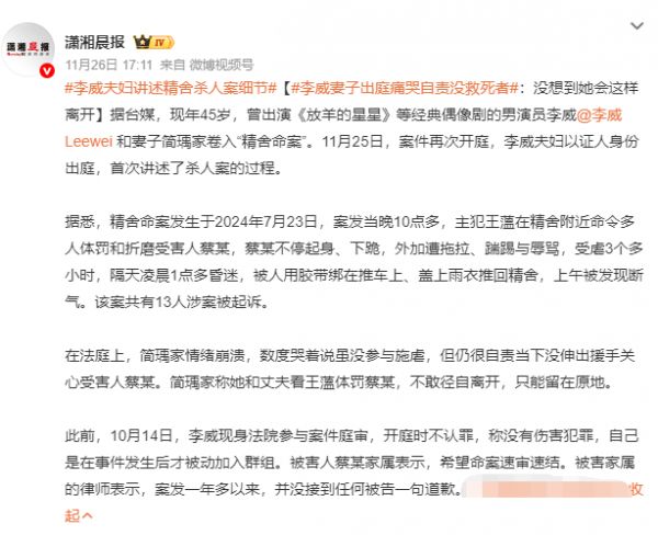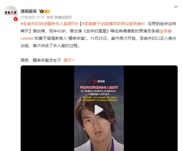 据台媒,曾出演《放羊的星星》等经典偶像剧的男演员李威和妻子简瑀家卷入了备受关注的 “精舍命案”。11月25日,该案再次开庭审理,李威夫妇以证人身份出庭作证,首度公开讲述了这起杀人案的完整经过。