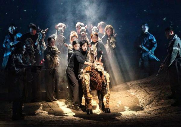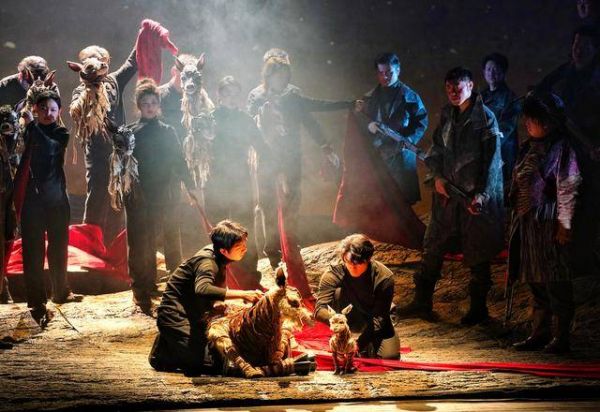 在舞台呈现上,舞美设计常炜以“山的血脉”为核心意象,山体内部的纹理宛若血液流动,山石土地俱在跳动、呼吸。整体来说,《可可西里》的舞台置景变化并不剧烈,灯光、景片以及经幡等装饰以恰到好处的力度表明时间地点的转换,暗喻剧情和人物内心的走向——在有些舞台作品选择以噱头和炫技招揽观众的当下,《可可西里》流淌着一种久违的、质朴的暖意,主创团队为这部作品付出了足够的诚意,比如,无论是电影《可可西里》,还是人们对这片净土的既有认知,动物都在其中扮演重要的角色,但毫无疑问,要在舞台上把动物塑造得真实且有艺术表现力,并不容易。主创团队没有偷工减料地绕过这个难题,而是以模仿动物习性的偶代替,当“母羊”的腹中剖开一卷鲜红的长绸,“小羊”跌跌撞撞地学着起身时,温柔洒落的天光配合层层递进的音乐,把现场气氛推向一次动人的高潮。