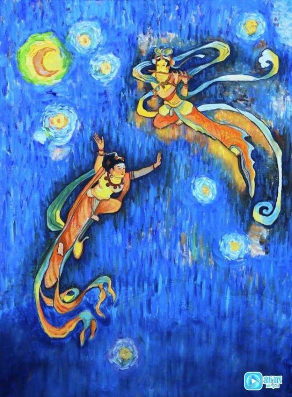 《友谊使者》作品延续了刘铁飞为2022北京冬奥创作的《踏雪飞天》风格,画面中两位飞天女子腾跃而起,在星月夜空中飞舞,上面的飞天正在演奏,下面的飞天双臂向上迎合,美妙的乐曲响彻星空,宇宙中一片和谐。作品是对人类永恒追求的赞美,表达了友谊、和平的理念。