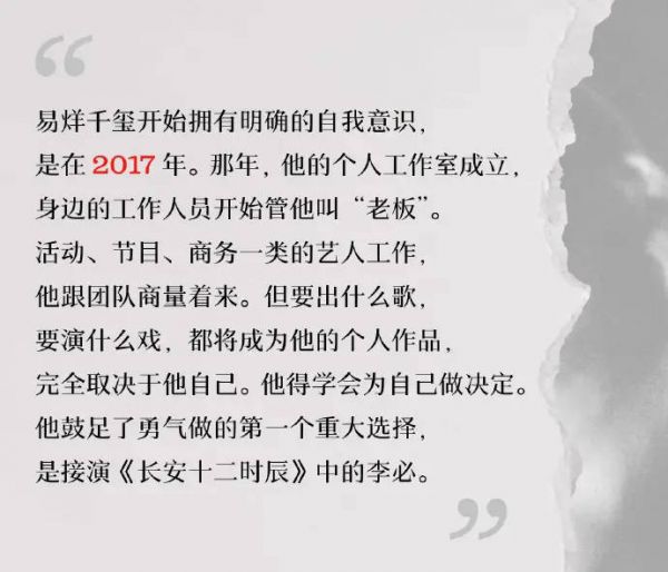 12月3日,易烊千玺最新采访内容曝光,他坦言2017年是自己自我意识开始明确的节点,而当时他鼓起勇气做出的首个重大抉择,便是接下《长安十二时辰》里李必这个角色。
