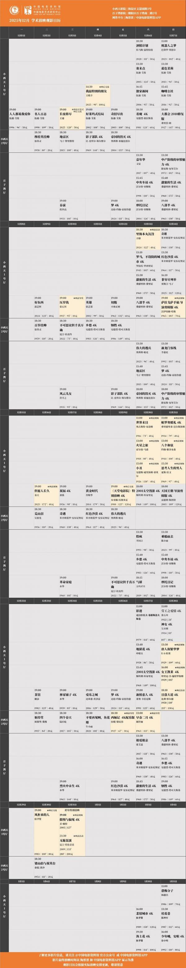 2025京苏跨年放映节昨天均已开票并售罄,向大家表示由衷的感谢!所有场次均可在淘票票、中国电影资料馆APP购票,具体排片见末图,祝大家观影愉快。❤️