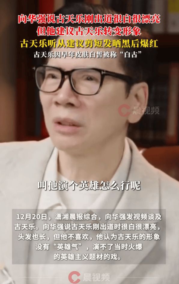 12月20号那天,向华强发布了一条视频,在里面聊到了古天乐。向华强说,古天乐刚出道的时候皮肤很白,长得也好看,留着一头长发,但他并不看好这个样子,他觉得古天乐的形象没有“英雄气”,没办法出演当时很火的英雄主义题材的影视作品。之后古天乐剪掉了长发,还把自己晒黑了,调整形象之后很快就火了起来。