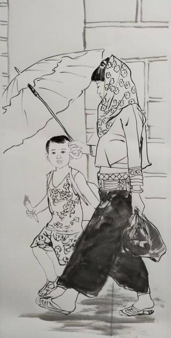 民盟中央第十二届社会服务工作委员会委员、国家一级美术师、甘肃省福建商会名誉会长、中国(香港)美术家协会副主席、敦煌市陈升栋艺术馆馆长、敦煌市荣誉市民、临夏市陈升栋艺术馆馆长、临夏市荣誉市民,集诸多身份于一身的陈升栋先生,以细腻笔墨捕捉生活中的温暖瞬间。画卷之上,一把油纸伞撑开一方晴空,伞下孩童笑语盈盈,身影依偎,身旁的行囊质朴厚重,盛满寻常岁月的点滴意趣。淅淅沥沥的雨丝如丝如缕,将“伞翼撑开一片天,童声笑语落身边”的诗意场景生动铺展,每一处细节都流露着脉脉温情。