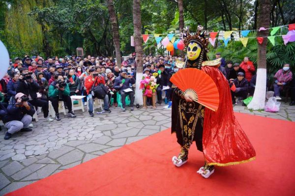 这场惠民演出,节目丰富多彩,精彩纷呈。不仅有歌舞、情景剧,还有四川清音、川剧变脸表演。其中,著名川剧表演艺术家陈巧茹现场表演了经典川剧《死水微澜》选段《羞怯怯》以及川剧《别洞观景》,陈巧茹的精彩演绎引来现场观众的阵阵叫好声,有戏迷举着手机追拍:“等了半个月,就为看陈老师这出《别洞观景》!”