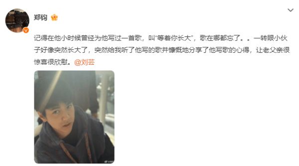 近日,郑钧在社交平台分享了15岁儿子Jagger的近照,还配文感慨道:“记得他小时候,我曾专门为他写过一首歌叫《等着你长大》,现在歌在哪儿都记不清了。一转眼的功夫,小伙子好像突然就长大了,还主动给我听了他自己写的歌,大方分享了写歌时的心得,作为老父亲,真的又惊喜又欣慰。”照片里,15岁的Jagger正看向镜头,五官俊朗帅气,长相自带混血感!更让人称赞的是,年仅15岁的他就已经解锁了写歌技能,着实年少有为!